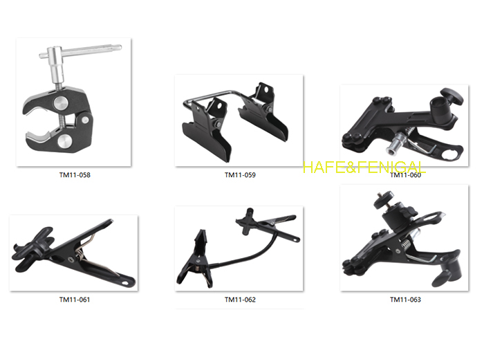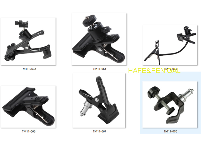 | TM11-060 | Büyük Klips Kelepçe | 5/8” Alıcı; 3/8”-16 Dişi Diş | Mühendislik plastiği + metal (vidalar, yaylar) | Siyah | Fotoğrafçılık ekipmanı montajı; teçhizat/stand aksesuarı takma | Ağırlık: 0,25; Büyük klips tasarımı; 3/8”-16 dişi diş |